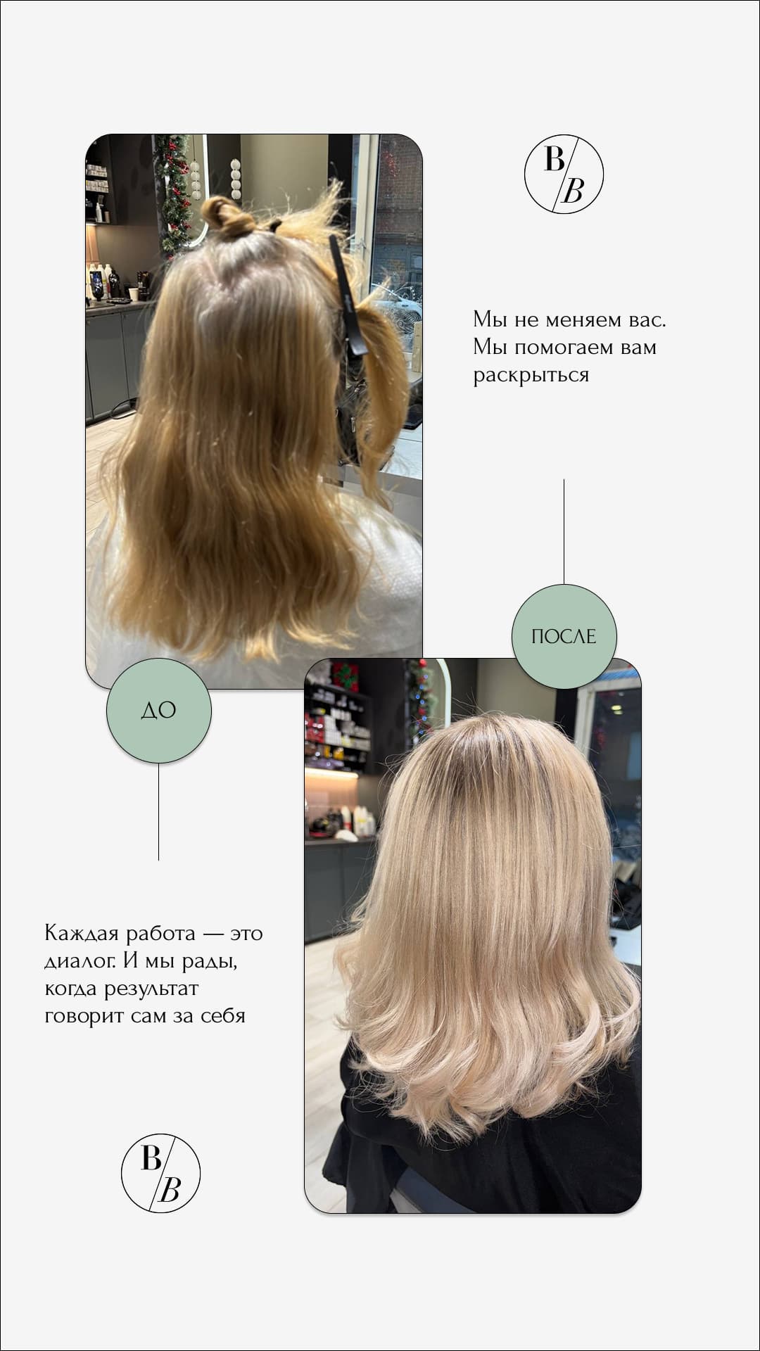 Наша главная ценность — ваше состояние и ощущения после визита. Мы стремимся создать атмосферу комфорта, доверия и заботы, где каждая гостья может расслабиться и почувствовать внимание к себе. Brunettes/Blondes World — это салон красоты в Уфе, куда приходят за красивыми волосами, высоким сервисом и уверенностью в своем образе.